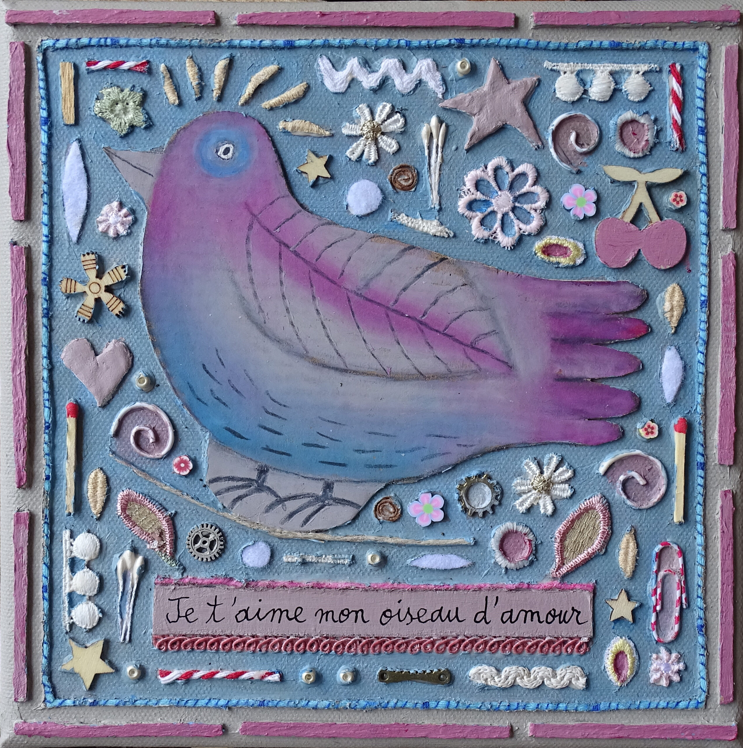 Je t’aime mon oiseau d’amour est une œuvre de Marie Morel réalisée en 2025 au format 20 x 20 cm.